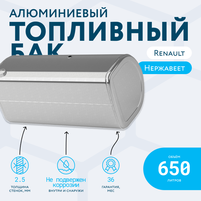 Алюминиевый бак не подвержен коррозии, что делает его более долговечным, а так же сбережет вашу топливную систему. Бак из алюминия в два раза легче стального бака, хотя он и изготовлен из листа увеличенной толщины в 2,5 мм. В конструкции предусмотрены цельные перегородки, которые проварены по периметру. Баки из алюминия так же оснащены заливной горловиной с самозапираемым непроливаемым клапаном (который становится барьером для разлива топлива, а так же становится защитой от попадания мусора в бак при открытой крышке) . Кроме того, однозначно что алюминиевый бак выглядит намного привлекательнее и дороже - где бак в том числе становиться и элементом тюнинга автомобиля. На алюминиеввые баки действует увеличенная гарантия - 36 месяцев.
