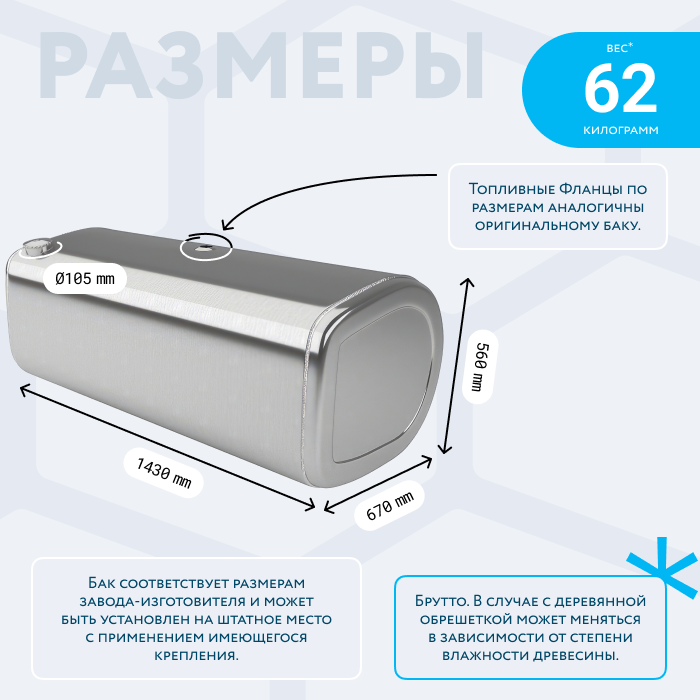 - Так же, если вы приобретаете алюминиевый топливный бак, он будет в деревянной обрешетке (для усиления защиты при транспортировке). При просчете веса и объема, цена за доставку может измениться по факту взвешивания на самом терминале транспортной компании. Так как деревянная обрешетка соответственно изготовлена из древесины, и она имеет свойство значительно набирать вес в зависимости от влажности окружающей среды.